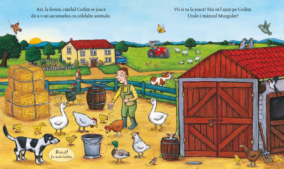 La ferma unde locuiește, cățelul Codiță are îndatoririle lui pe care și le îndeplinește, desigur, zi de zi cu seriozitate. Dar uneori are chef de joacă, iar prietenii lui abia așteaptă. Hai, ce să se joace? De-a v-ați ascunselea? Gata! Mânzul, vițelușa, găina, purcelușa, mielul, chiar și tușa Gâscă s-au pitit bine de tot. Dă-i drumul, Codiță, aleargă și găsește-i pe toți!
