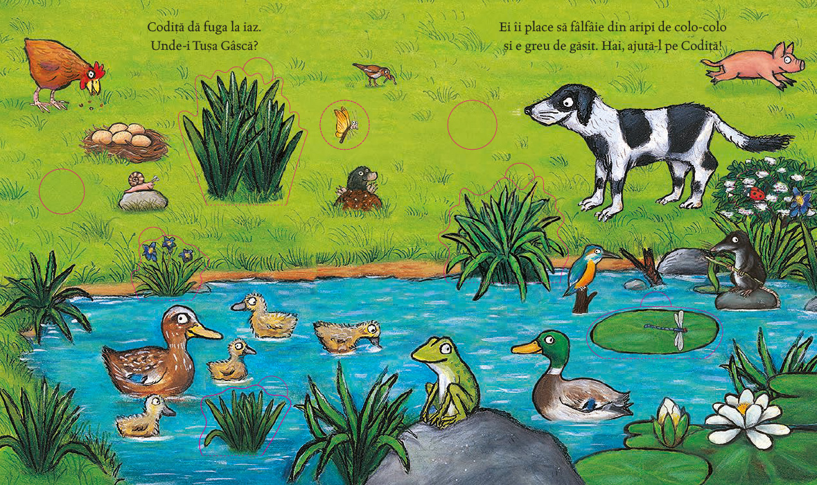 Renumitul ilustrator Axel Scheffler a creat această carte special pentru a dezvolta la copiii mici - care învață cel mai bine prin joacă - atenția, spiritul de observație și abilitățile motorii fine. Cartea este integral cartonată, cu colțuri rotunjite și conține peste 30 de clapete sub care copiii vor fi încântați să descopere animalele împreună cu simpaticul cățel Codiță.
