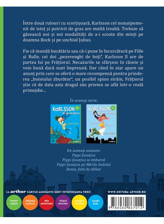 Între două rulouri cu scorțișoară, Karlsson cel nemaipomenit de isteț și potrivit de gras are multă treabă. Trebuie să găsească noi și noi modalități de a-i scoate din minți pe doamna Bock și pe unchiul Julius.
